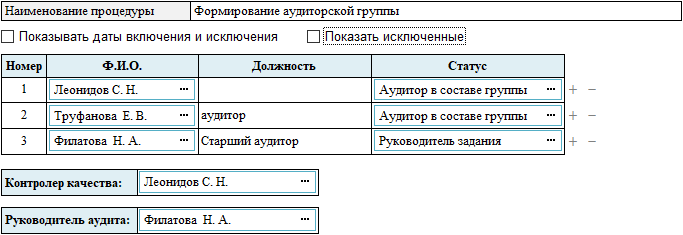 Аудиторская процедура КК1.1 «Формирование аудиторской группы» предназначена для формирования состава аудиторской проверки.
