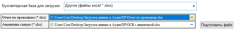 Поле «Отчет по проводкам» и «Аналитика сальдо» позволяют выбрать файлы на вашем устройстве. Чтобы открыть диалоговое окно для выбора соответствующего отчета, нажмите на значок многоточия (...) в правой части поля. Кнопка «Подготовить файл» определяет с каким отчетом программа в текущий момент работает.