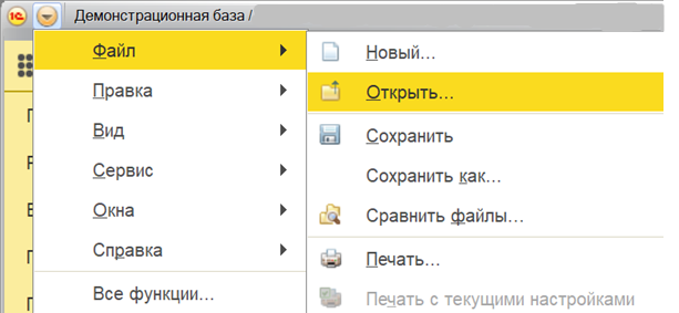 2. В главном меню программы нажмите «Файл» - «Открыть» как показано на картинке ниже. Или можно потянуть мышью файл Обработки и отпустить на открытое окно 1С.