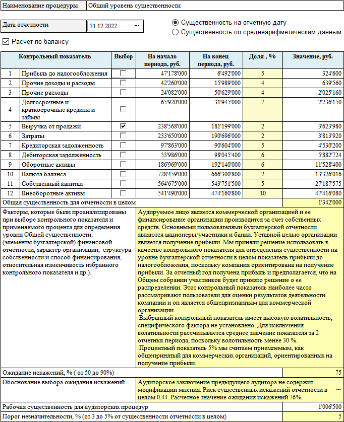 Так же следует определить метод расчета «Существенность на отчетную дату» или «Существенность по среднеарифметическим данным». Расчет по среднеарифметическим данным может быть полезен в случае, если в течении отчетного периода были резкие изменения показателей отчетности.