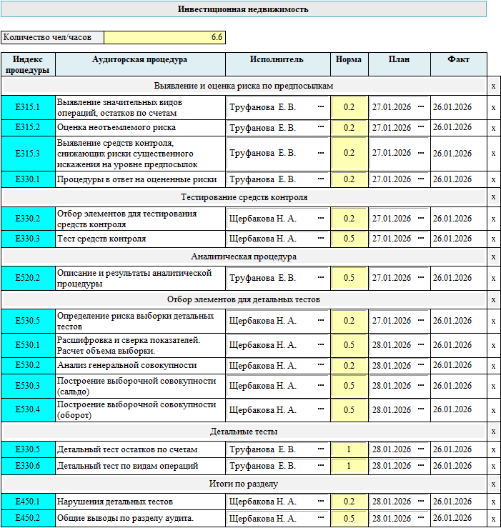 Трудоемкость каждой процедуры видна в каждой программе по разделу. Ее значение можно менять по усмотрению аудитора. В программах по разделу есть возможность подстроить трудоемкость процедур под ту величину, которую аудитор считает соответствующей данному заданию. Для этого достаточно изменить значение в поле бланка программы «Количество чел/часов». Во всех процедурах трудоемкость сразу изменится. Общее значение будет примерно соответствовать введенному числу, с учетом того, что для любой процедуры трудоемкость не может быть менее 0.1 чел/час.