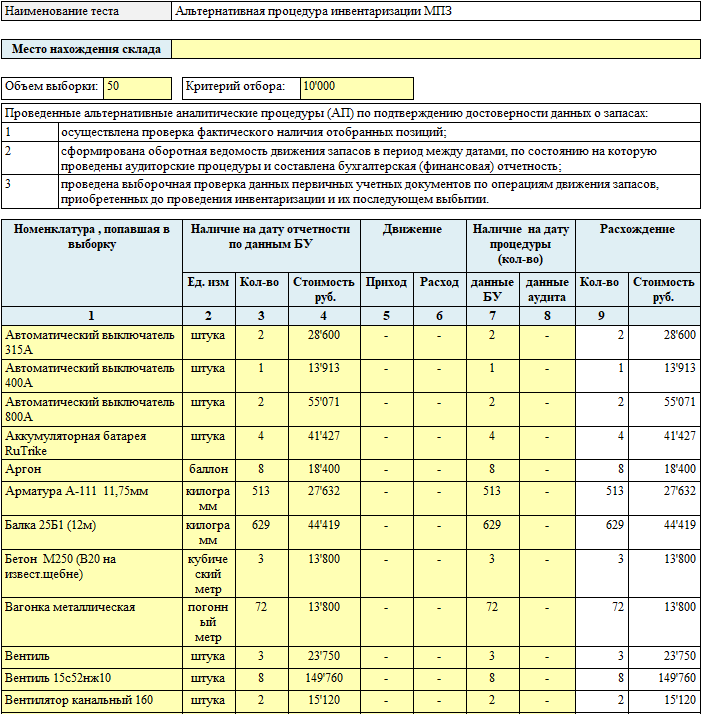 Аудиторская процедура F501.3 «Альтернативная процедура инвентаризации МПЗ» предназначена для выявления искажений количественного учета.