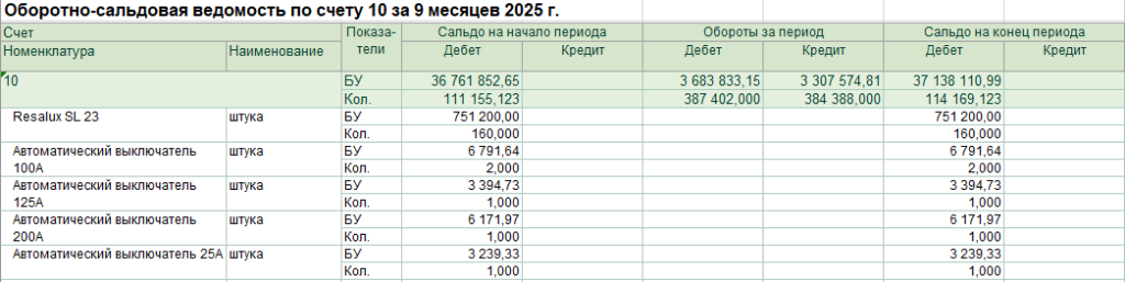 Пример ОСВ по счету с количественным показателем и единицей измерения.