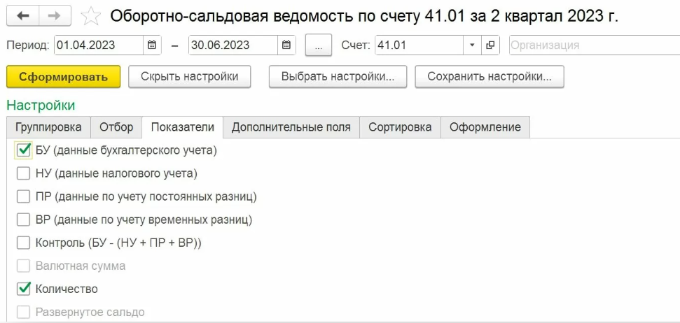 В зависимости от платформы и конфигурации программы 1С позволяет создать оборотно-сальдовые ведомости по счету с одним количественным показателем или с двумя – с суммовым и количественным.