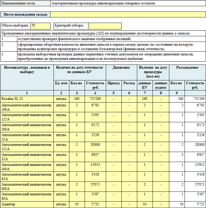 Аудиторская процедура FА501.3 «Альтернативная процедура инвентаризации товарных остатков» предназначена для выявления искажений количественного учета товарных остатков.