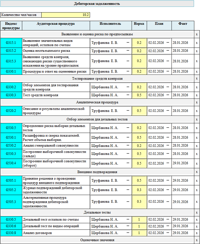 Трудоемкость каждой процедуры видна в каждой программе по разделу. Ее значение можно менять по усмотрению аудитора. В программах по разделу есть возможность подстроить трудоемкость процедур под ту величину, которую аудитор считает соответствующей данному заданию. Для этого достаточно изменить значение в поле бланка программы «Количество чел/часов». Во всех процедурах трудоемкость сразу изменится. Общее значение будет примерно соответствовать введенному числу, с учетом того, что для любой процедуры трудоемкость не может быть менее 0.1 чел/час.