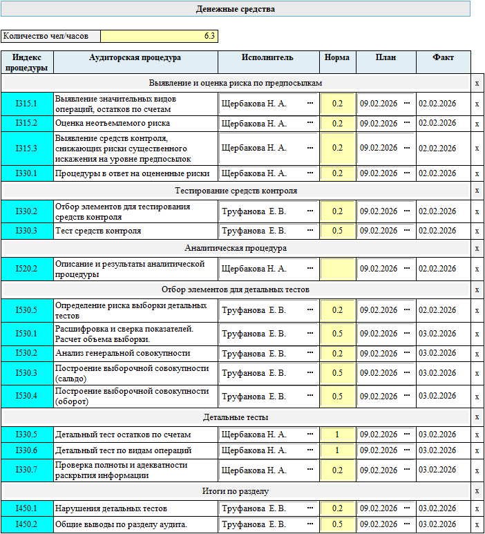 Трудоемкость каждой процедуры видна в каждой программе по разделу. Ее значение можно менять по усмотрению аудитора. В программах по разделу есть возможность подстроить трудоемкость процедур под ту величину, которую аудитор считает соответствующей данному заданию. Для этого достаточно изменить значение в поле бланка программы «Количество чел/часов». Во всех процедурах трудоемкость сразу изменится. Общее значение будет примерно соответствовать введенному числу, с учетом того, что для любой процедуры трудоемкость не может быть менее 0.1 чел/час.