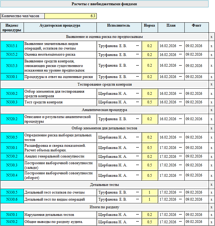 Трудоемкость каждой процедуры видна в каждой программе по разделу. Ее значение можно менять по усмотрению аудитора. В программах по разделу есть возможность подстроить трудоемкость процедур под ту величину, которую аудитор считает соответствующей данному заданию. Для этого достаточно изменить значение в поле бланка программы «Количество чел/часов». Во всех процедурах трудоемкость сразу изменится. Общее значение будет примерно соответствовать введенному числу, с учетом того, что для любой процедуры трудоемкость не может быть менее 0.1 чел/час.