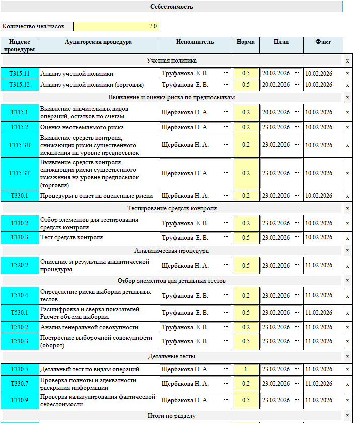 Трудоемкость каждой процедуры видна в каждой программе по разделу. Ее значение можно менять по усмотрению аудитора. В программах по разделу есть возможность подстроить трудоемкость процедур под ту величину, которую аудитор считает соответствующей данному заданию. Для этого достаточно изменить значение в поле бланка программы «Количество чел/часов». Во всех процедурах трудоемкость сразу изменится. Общее значение будет примерно соответствовать введенному числу, с учетом того, что для любой процедуры трудоемкость не может быть менее 0.1 чел/час.
