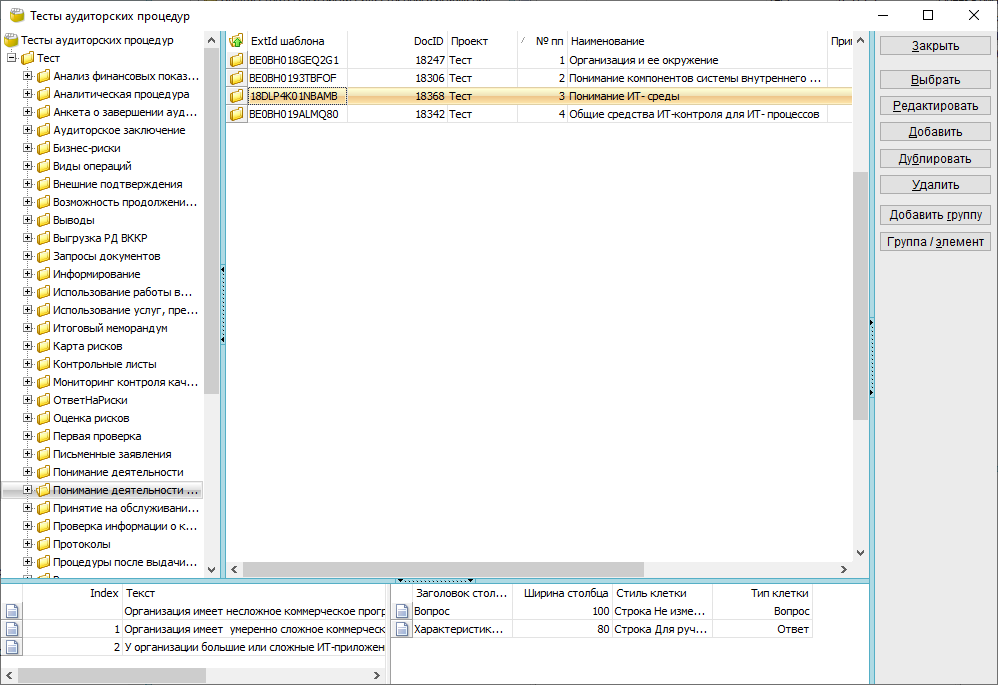 Список процедур формируется автоматически из шаблона методики аудита – справочник «Тесты» - «Понимание деятельности 2022» - «Понимание ИТ-среды».