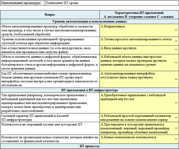 Аудиторская процедура 315.1 «Понимание ИТ-среды» предназначена для того, чтобы аудитор мог получить представление об информационных технологиях, используемых в компании, оценить их влияние на процессы подготовки финансовой отчётности и определить риски, связанные с их использованием.