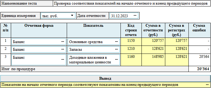 Аудиторская процедура 330.2 «Проверка соответствия показателей на начало отчетного и конец предыдущего периодов» предназначена для сравнения сумм показателей в проверяемой отчетности с аналогичным показателем в отчетности, утвержденной в предыдущем году и представленной пользователям, включая ФНС.
